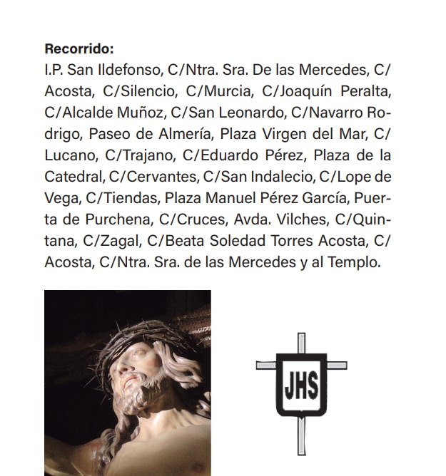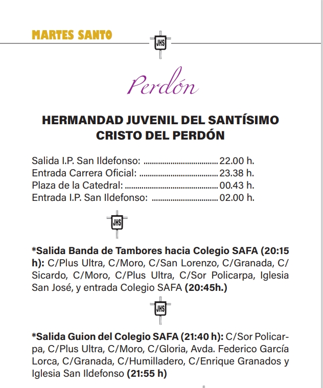 Horarios y recorridos Martes Santo 2026 hace 15 horas 0Comentario A continuación detallamos los horarios e itinerarios que nuestra Hermandad ha fijado para el Vía Crucis Penitencial de Silencio del próximo 31 de marzo, Martes Santo. Etiquetas: Martes SantoShare: